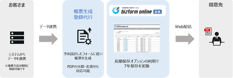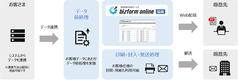 お客さまの連携データにあわせてデータ前処理を実施し、Web配信と郵送のデータ仕分けを行います。