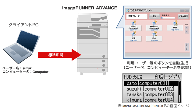 プリント指示をしたPCの「ユーザー名」、「コンピューター名」を識別し、自動で利用ユーザーごとのプリントボタンを生成します。管理者による事前のユーザー登録は不要な上、利用ユーザーも特別な設定は必要ありません。通常のプリント指示をするだけで利用可能です。