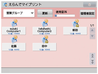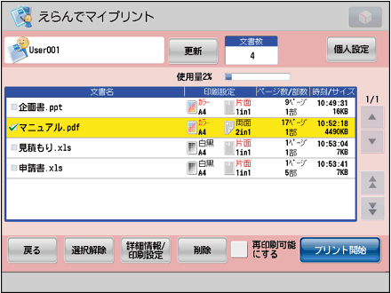 自分のプリントボタンを押すと、自分だけのジョブ一覧画面を表示します。出力前に印刷設定を確認し、必要なものだけ出力することによりミスプリントを削減します。