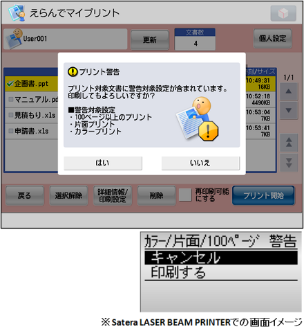 また、プリント開始しようとした時にポップアップでお知らせし、利用ユーザーのコスト意識向上を促すことも可能です。