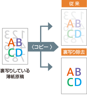 下地全体の色を飛ばす調整方法とは異なる、無彩色のハイライトのみを白に近づける色変換により、カラークオリティーへの影響が少ない裏写り除去が可能です。裏写りしやすい薄紙をコピーする際などに効果を発揮します。