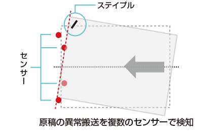 コーナーステイプルされた原稿を誤ってADF読み取りしたときに、原稿の傾き発生をセンサーが検知し搬送を停止する「異常搬送検知」機能を搭載。原稿の紙詰まりや原稿破損のリスクを低減します。また、「重送検知」機能により、原稿が2枚重なっていないかを、超音波センサーで高精度に判断し重送を検知。複数原稿のコピーやスキャンのミスを低減します。