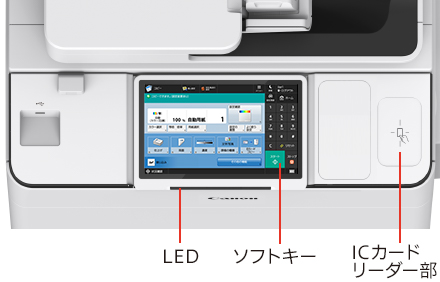 10.1inch、フルフラットのタッチパネルを採用。ソフトキーへのタッチのみで操作が完結するハードキーレス設計と、本体右側に配置したICカードリーダー部※1により、最短の視線移動と手の動線を実現します。操作パネル前面のLEDは発光面積を拡大し、離れた場所からでも見やすく、近くでは眩しさを抑えた設計です。また、従来と同様な操作感を提供するハードテンキーもオプションで用意しています。