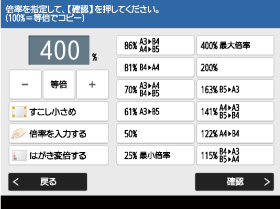 1%きざみに任意の倍率を設定して、縮小/拡大コピーします。倍率はタテ/ヨコ同率で、25%~400%で設定することができます。