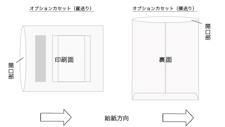 オプションカセットを使用して縦送りする場合、薬袋開口部を給紙方向とは反対(向かって左)に向けて、印刷面を上にしてセットします。また、横送りする場合、薬袋開口部を向かって奥に向けて、印刷面を下にしてセットします。
