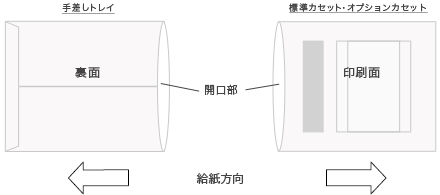 標準カセットやオプションカセットを使用する場合、薬袋開口部を給紙方向とは反対(向かって左)に向けて、印刷面を上にしてセットします。