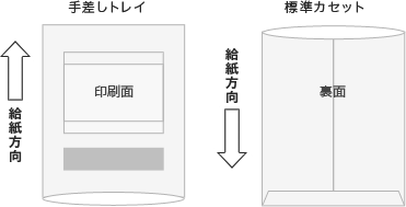 手差しトレイを使用する場合、薬袋開口部を給紙方向とは反対(向かって手前)に向けて、印刷面を上にしてセットします。