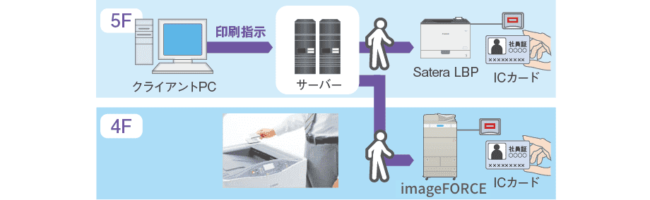 個人認証システムと連携し、自分の印刷ジョブを、必要なときに、どのプリンター※1からでも出力できます。例えば、デスクのある5階から印刷指示し、会議直前に4階のプリンターで印刷することも可能。好きな場所で、セキュアに印刷物を手にできる環境を提供します。