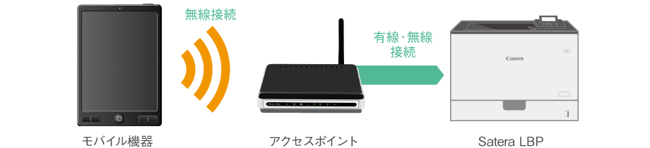 アクセスポイントとSatera LBP間は無線または有線LAN接続が必要です。