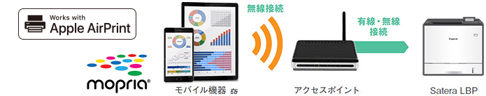 iPhone/iPad/Macでは「AirPrint」を、Mopria認証を受けたAndroid4.4以上の端末からMopriaプリントサービスを利用できます。