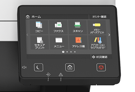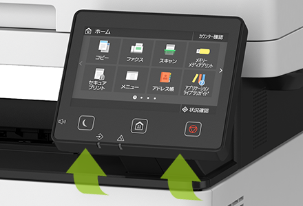 印刷やFAX、スキャナーなどを、5インチの大画面タッチパネルに触れながら、直感的に操作できます。チルト式パネルを採用したことで、設置場所や使う人の目線に合わせてパネルの角度調整が可能となり、より操作性が向上しています。
