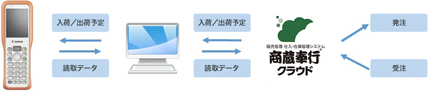 ハンディターミナルで入出庫・棚卸における入力業務の軽減を実現し、入力したデータを商蔵奉行へ取込むと、商蔵奉行側の在庫数量に反映されます。