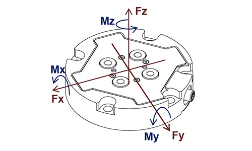 力覚センサとは、物体の荷重3軸(Fx、Fy、Fz)や回転させる力(モーメント)3軸(Mx、My、Mz)の大きさ・方向を測定するセンサです。