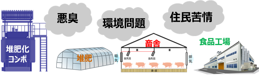 - 堆肥化施設や食品産廃リサイクル施設の臭気低減(悪臭対策)