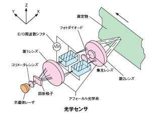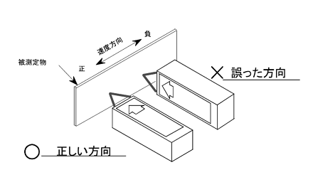 測定物からの散乱光は測定物の移動により発生するドップラー効果により周波数シフトをした光となり、フォトダイオード上に生じるスペックルの干渉光はF=2Vd+fRのドップラー周波数成分を持ったビート信号となり、静止状態からの測定が可能になっています。(dは対象物上で2光束が構成する干渉縞ピッチ)このドップラー周波数を信号処理することにより測定物の速度を算出しています。