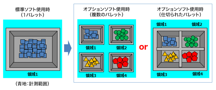 各領域で1種類の部品を認識します。領域数に制限はないものの、領域が狭くなると部品がパレットの壁に隠れてしまう恐れがあります。