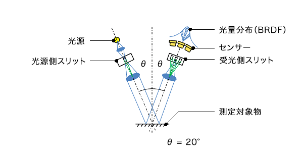本測定装置では受光角20°あるいは60°に対して、正反射およびその近傍で測定された反射光強度の角度分布を取得することができます。