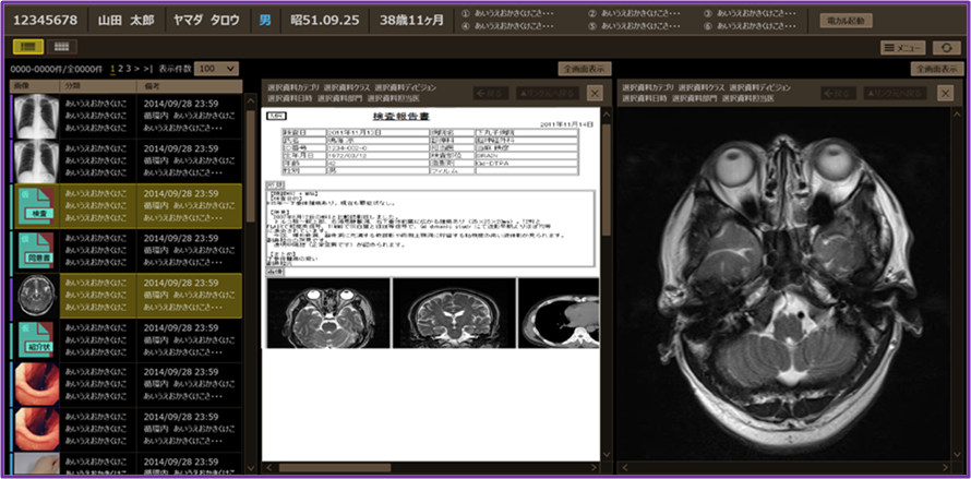 患者毎のマトリクスビューやDICOM画像、汎用画像、所見レポートを1画面内で複数表示
