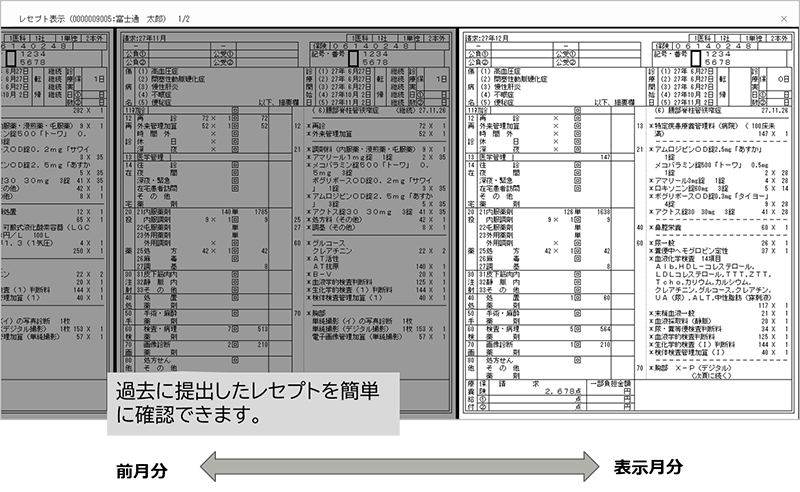 審査支払機関の縦覧審査(複数月のレセプトチェック)と同様に、窓口業務のレセプト表示で過去のレセプトをスクロール表示することができます。