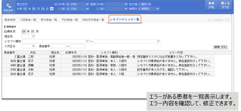 レセプト電算データを自動作成する際にエラーがあった患者は、窓口業務の患者選択画面の「レセプトチェック一覧」画面で確認できます。