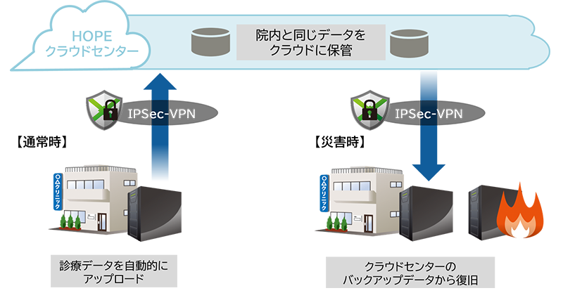 日々蓄積される診療データを自動的にクラウドセンターにアップロードし、安全に保管しますので、万一のときも安心して事業を継続することができます。