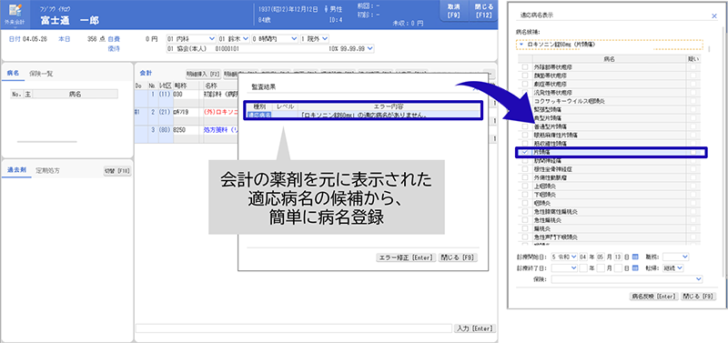 従来は電子カルテで対応していた適応病名チェックを用いた病名登録が、会計業務から利用可能になりました。