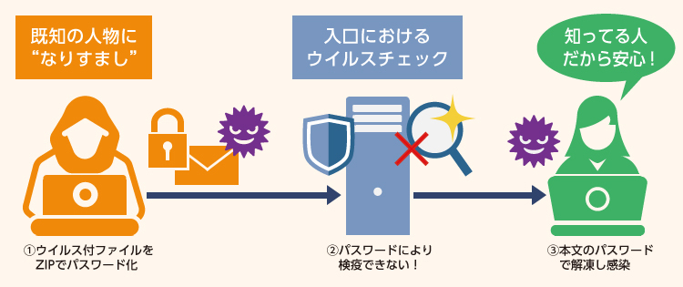 既知の人物になりすまして、ウイルス付ファイルをZipでパスワード化して送信します。(解凍パスワードも同メール本文内に記載する場合があります。)
