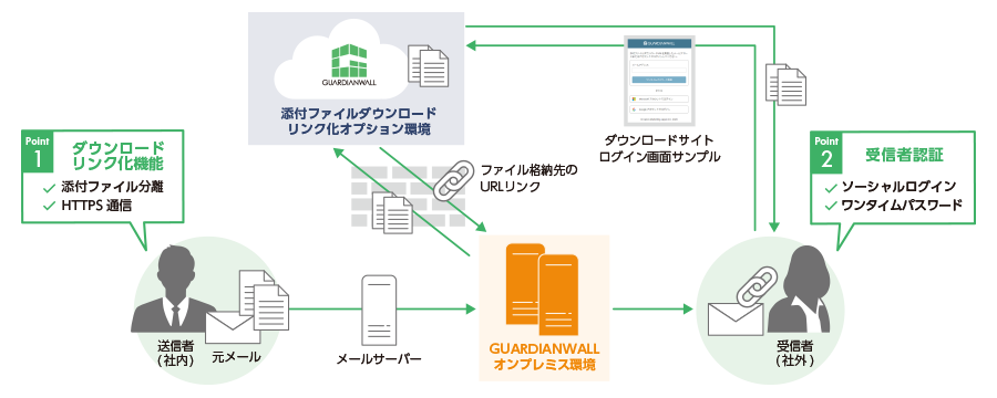 クラウド版では、ご利用可能なメール環境をMicrosoft 365、Google Workspaceに限定しておりますが、本オプションとGUARDIANWALLのオンプレミス製品を組み合わせることで、その他のメール環境でも「添付ファイルダウンロードリンク化」機能の利用が可能です。