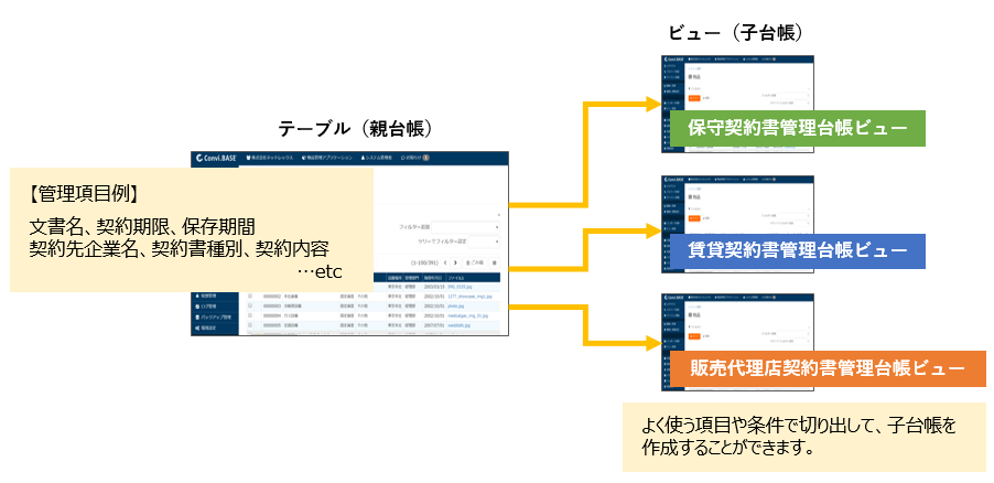 台帳の管理項目は完全自由に設定可能。既存のExcel台帳データをインポートしてConvi.BASE上で一元管理を実現できます。