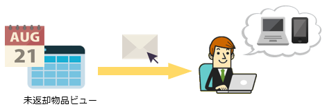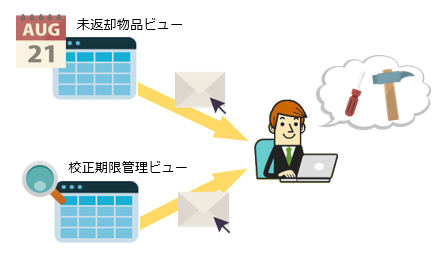ビューの表示条件に合致する情報をメールで配信することが可能です。校正漏れや返却漏れ防止に活用できます。