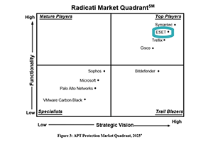 Radicatiの本レポートは、ゼロデイ攻撃や持続的な悪意のある攻撃を検知、防止、復旧するための統合ソリューションであるAdvanced Persistent Threat Protectionを調査し、機能性と戦略ビジョンの2つの基準で各ベンダーを評価します。このたびのTop Playerへの認定は、ESETが機能の幅の広さと深さ両方を備えた製品で現在の市場をリードしていることに加え、将来への明確なビジョンを持っていることを意味します。