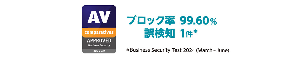 世界有数の独立系テスト機関のAV-Comparativesが、実環境に合わせたテストシナリオでセキュリティベンダーを評価するBusiness Security Testにおいて、APPROVED賞を受賞しました。ESETの特長である「高検知率」&「低い誤検知率」が認められています。サイバー攻撃による侵害やデータ漏えいなどのリスクを最小限に抑えることが実証されました。