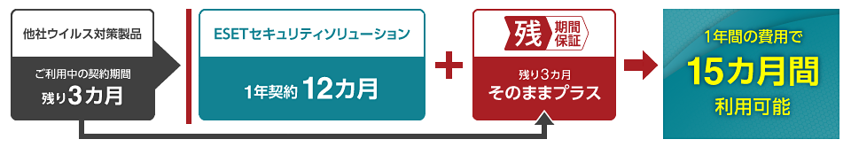 他社ウイルス対策ソフトウェアからESET対象製品へのお乗り換えの場合、ご利用中の他社製品の残期間を保証する制度があります。他社製品の残期間がある場合でも、早めのセキュリティ強化をご検討いただけます。