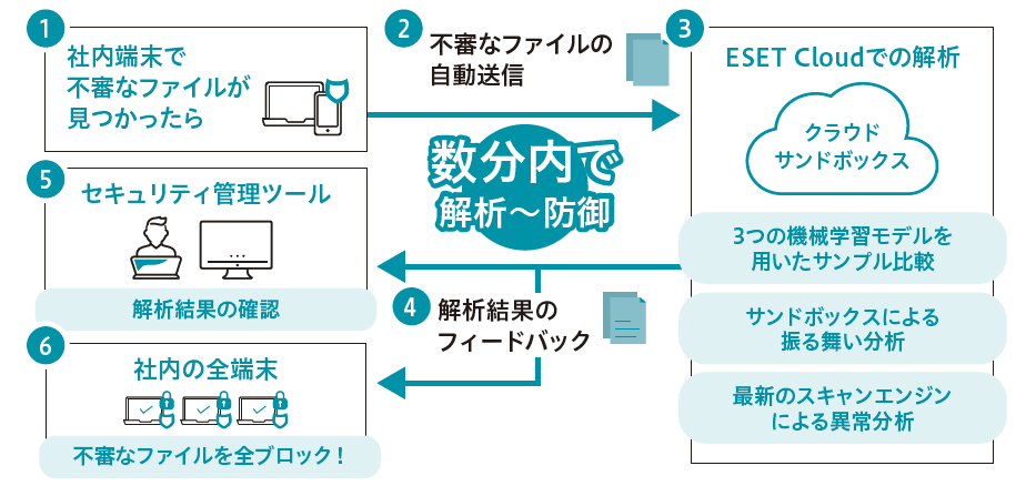 未知の脅威(ゼロデイ攻撃など)から保護。クラウド上で自動解析・自動防御。