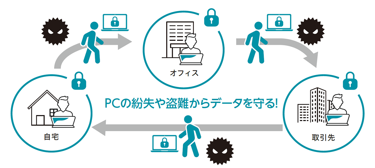 営業などの企業活動やリモートワークのため、PCを持ち歩くことが一般的になっている現在、ディスクの暗号化対策は基本的な情報漏えい対策です。本機能により機密データが保存されているPCのディスクを暗号化することで、持ち出し時のPC紛失や盗難が万が一あった場合でも、機密データの漏えいを防ぐことができます。