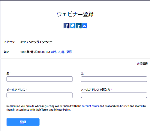 1.オンラインセミナーお申込み時にご入力いただいたご氏名・メールアドレスを入力いただき、登録ボタンを押下します。