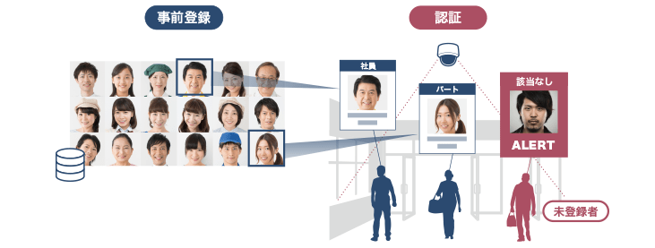 多くの人々が出入りする従業員通用口で、すべてのスタッフを警備員さんが把握するのは無理なこと。かといって、入れ替わりの多いパートやアルバイトまでICカードで管理するのはコスト面で厳しく、さらに広くて死角の多いバックヤードやストックスペースまでくまなく監視しようと思えば膨大な投資額が掛かります。こうした場合に有効なのが、顔認証による防犯システムです。通用口の使用が想定される人々の顔画像をあらかじめデータベースに登録しておき、部外者が関係者を装って侵入しようとした際に警備員に通知。通用口を監視カメラで見守っておくことで、犯罪を事前に抑止する効果も期待できます。