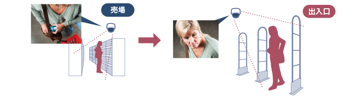精算の済んでいないセキュリティタグ付きの商品を持ち出そうとすると、店舗の出入り口のゲートでアラームを鳴らすEAS(電子式商品監視システム)。これから万引きをしようとする人に「この店で万引きは難しいのでは・・・」と印象を与え、犯行を思いとどまらせる意味でも設置効果は高く、万引き防止の切り札として普及が進んでいます。しかし、いくらゲートを設けても、逃げられてしまえば意味がありません。そこで有効になるのが、アラーム発報と同時に付近の映像を録画するという仕掛けです。EASと監視カメラの連動による先進的な防犯システムの構築が、万が一の際の犯人の特定に役立ちます。