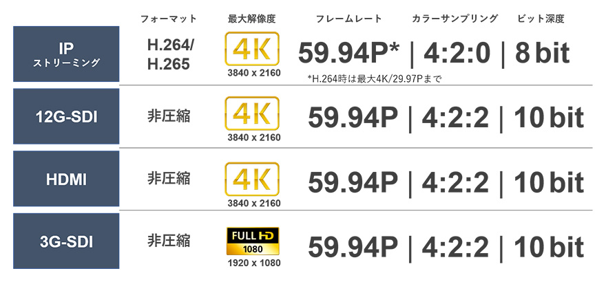 ケーブル1本で4K 60P映像を配信できる、12G-SDI出力端子を搭載。3G-SDI端子とあわせ、2系統の映像を同時出力することが可能になりました。