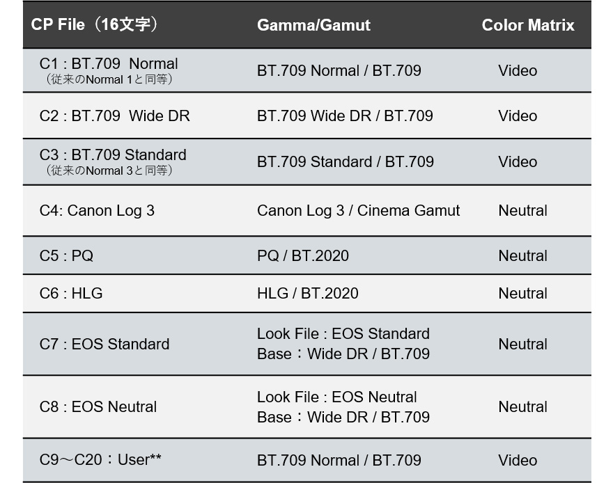 Custom Picture Fileを拡充し、EOS Standard/EOS Neutralに対応。幅広い制作環境への対応が可能です。