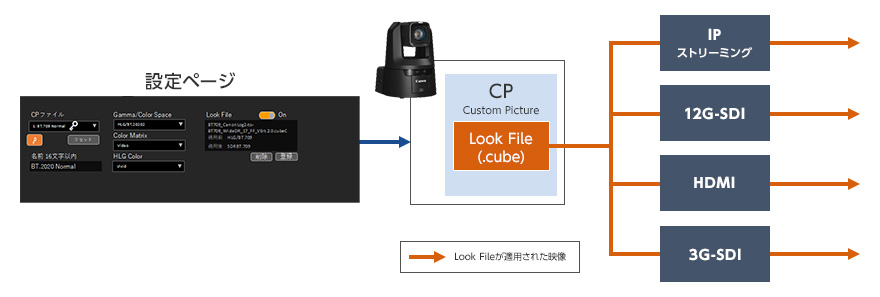カラーグレーディングソフトなどで作成した.cube形式の3D LUTをIP経由でカメラ内に取り込み、取り込んだ3D LUTを適用した収録が可能。これにより、カラーグレーディングを前提としないワークフローにおいても、意図したLookで収録することができ、効率的なワークフローを実現します。