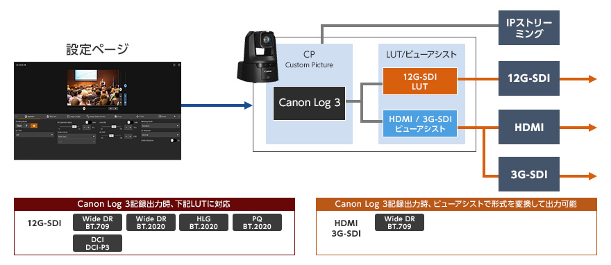 Canon Log 3を適用した映像は、広いダイナミックレンジを確保し、撮影後の編集を前提としてます。そのため、撮影時に表示される映像はそのままですと低コントラストでやや暗い映像になりますが、LUT/ビューアシスト機能を使用する事で、通常の映像と同等のコントラストを再現することができます。ユーザーが作成した3D LUT(User LUT)はIP経由で取り込みます。