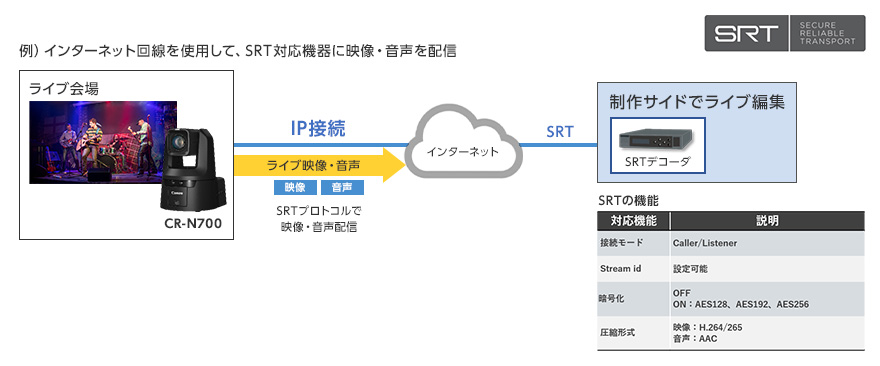 ライブ配信で一般的な従来のUDP伝送に比べ、低遅延で映像が乱れにくい高品質なライブ配信が可能なSRTプロトコルに対応。