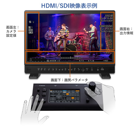 HDMI、SDI接続したモニターにOSD情報を重畳表示可能