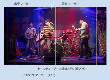 画面にマーカーを表示すると、構図を決めるガイドにしたり、適切なセーフティーゾーンを確認することができます。