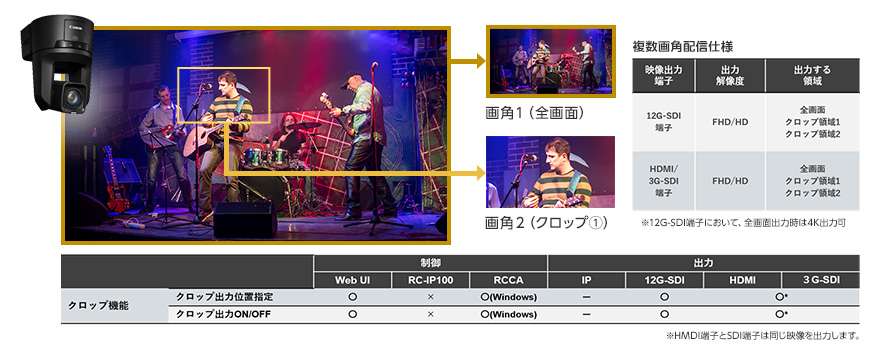 クロップは最大2か所までFHD/HDの2種類で設定できます。また設定ページとリモートカメラコントロールアプリ(RCCA)でクロップ設定・切り替えできます。またクロップした映像はズームすることも可能です。※1