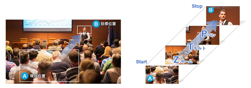 設定した目標位置(画角)と、指定した時間または速度の情報から、PTZ動作に要する時間を考慮し、連動した制御を行うことで、現在位置(A)からのPTZ同時スタート、目標位置(B)でのPTZ同時ストップを実現します。このようなPTZの操作性は、映像制作の現場において、演出意図や「撮りたい画」の要望に応えます。
