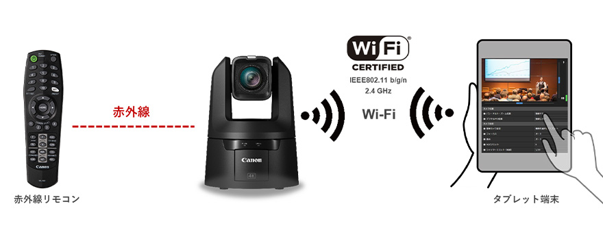 CR-N700は、LANケーブルによるIP接続のほかに、無線LAN接続も可能です。タブレット端末からカメラの設定ページを操作できます。