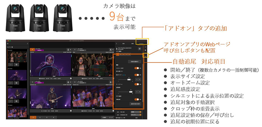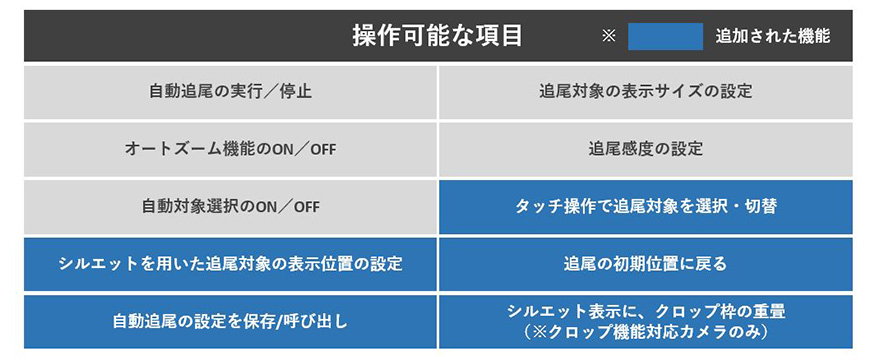 自動追尾機能の操作・設定に対応。カメラを複数台使用するシーンで、より効率的に自動追尾の操作・設定を行うことが容易になります。