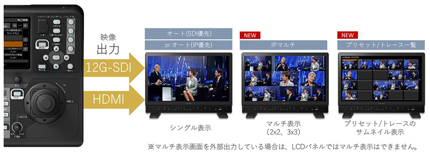 SDI OUT/HDMI OUT端子から、カメラ1台分の映像出力だけでなく、LCDパネル上で対応している2×2、3×3のマルチ表示画面、およびプリセット/トレースのサムネイル表示を外部モニターに出力可能。